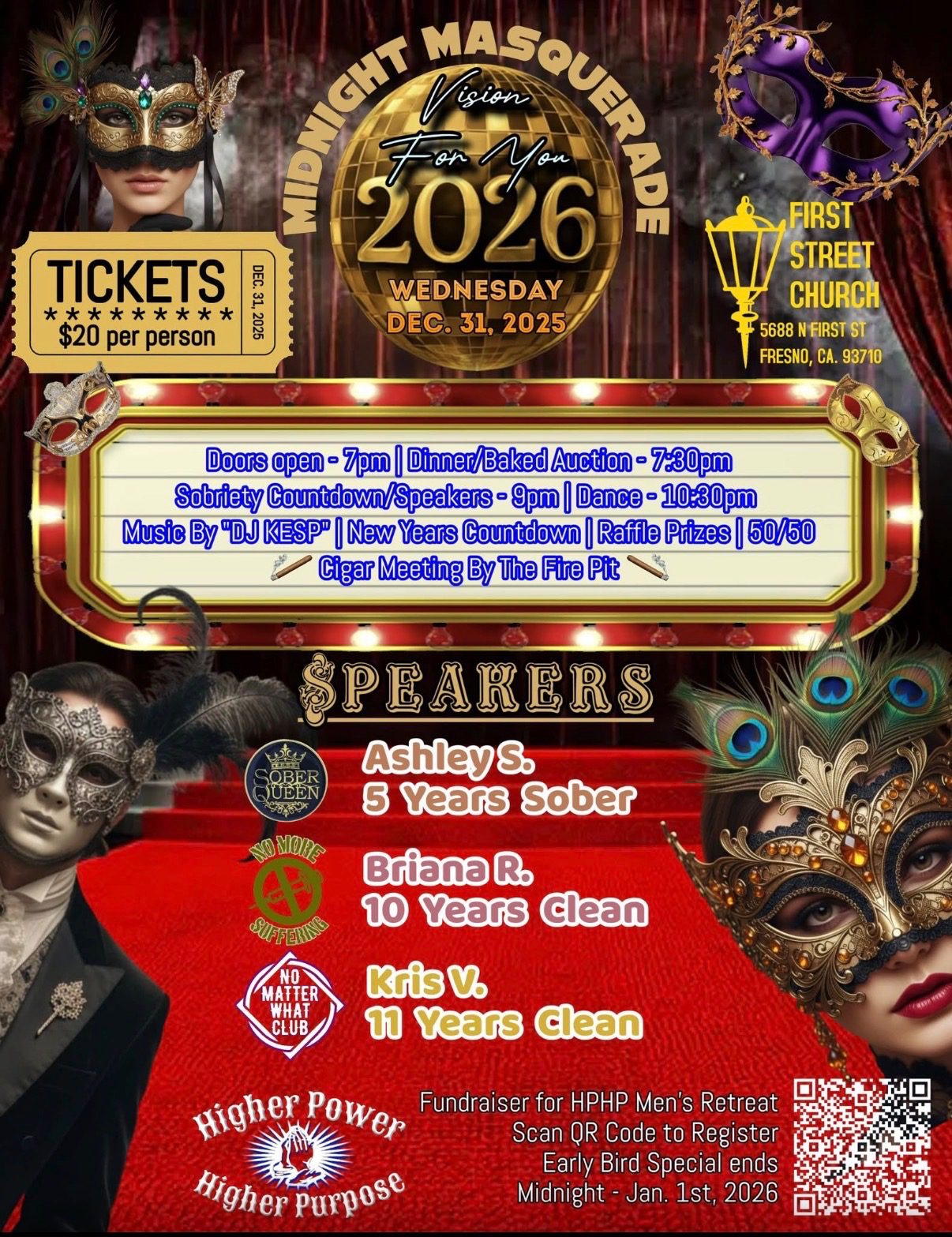 MidNight Masquerade - Vision for Your 2026 Wednesday, December 31, 2025 Doors open: 7pm Dinner/ Baked Auction: 7:30pm Sobriety Countdown/Speakers: 9pm Ashley S, – 5 yrs Sober Briana R. – 10 yrs Clean Kris V. – 11 yrs Clean Dance - 10:30pm Music By "DJ KESP" New Years Countdown Raffle Prizes | 50/50 Cigar Meeting […]